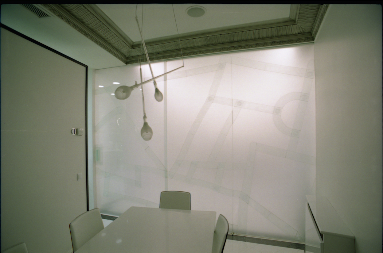 Disseny i realització de tots els elements de vidre dins el projecte integral d’interiorisme. Destaquem la paret mural amb porta corredera que separa menjador i office.